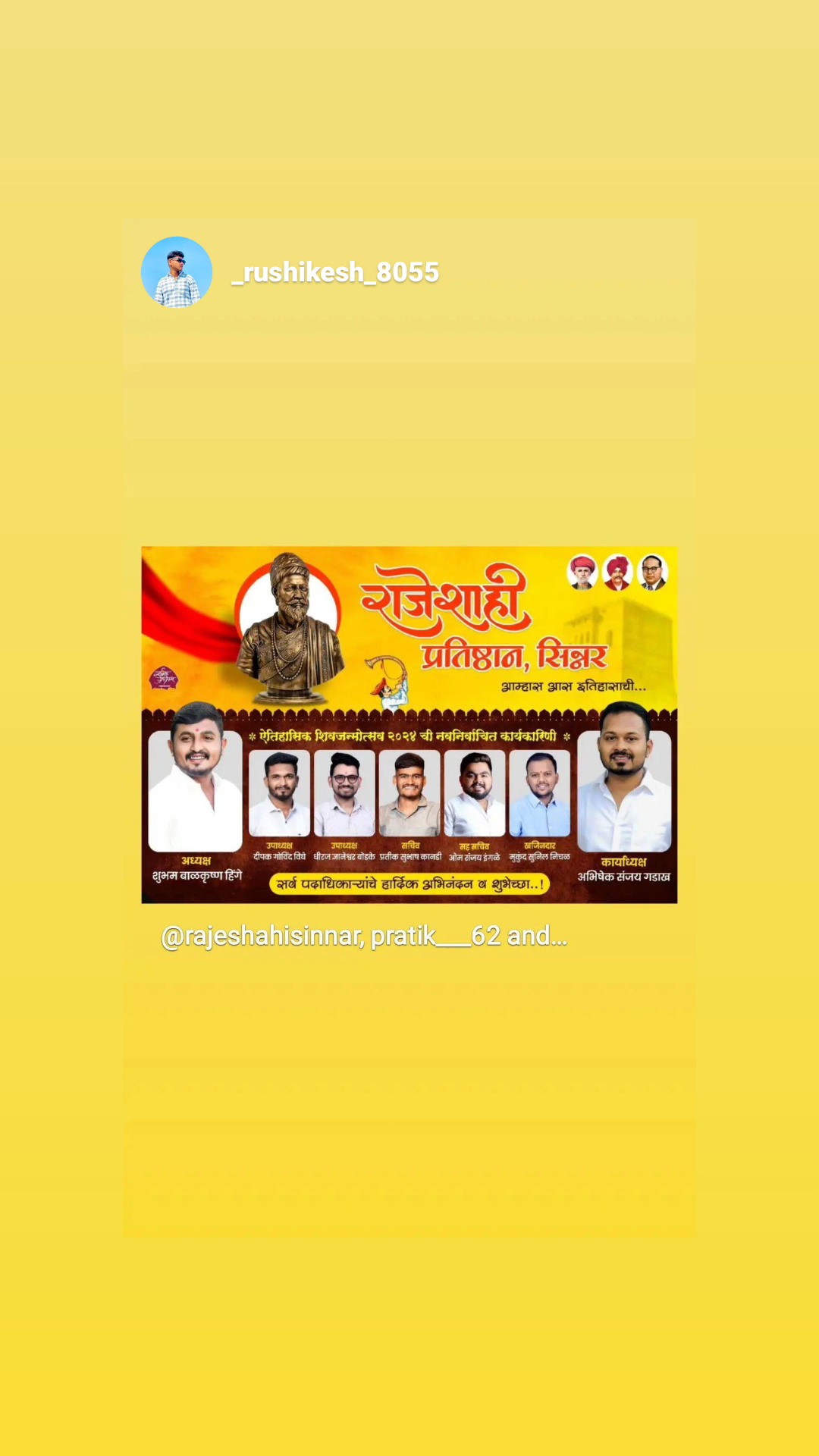 राजेशाही प्रतिष्ठान शिवजन्मोत्सव सोहळा समिती २०२६. तालुक्यातील प्रत्येक गावात राजेशाही प्रतिष्ठानचे नाव पोहोचवणे, युवकांना सामाजिक नेतृत्वासाठी घडवणे आणि आरोग्य, शिक्षण, पर्यावरण क्षेत्रात व्यापक कार्य करण्याचा संकल्प.